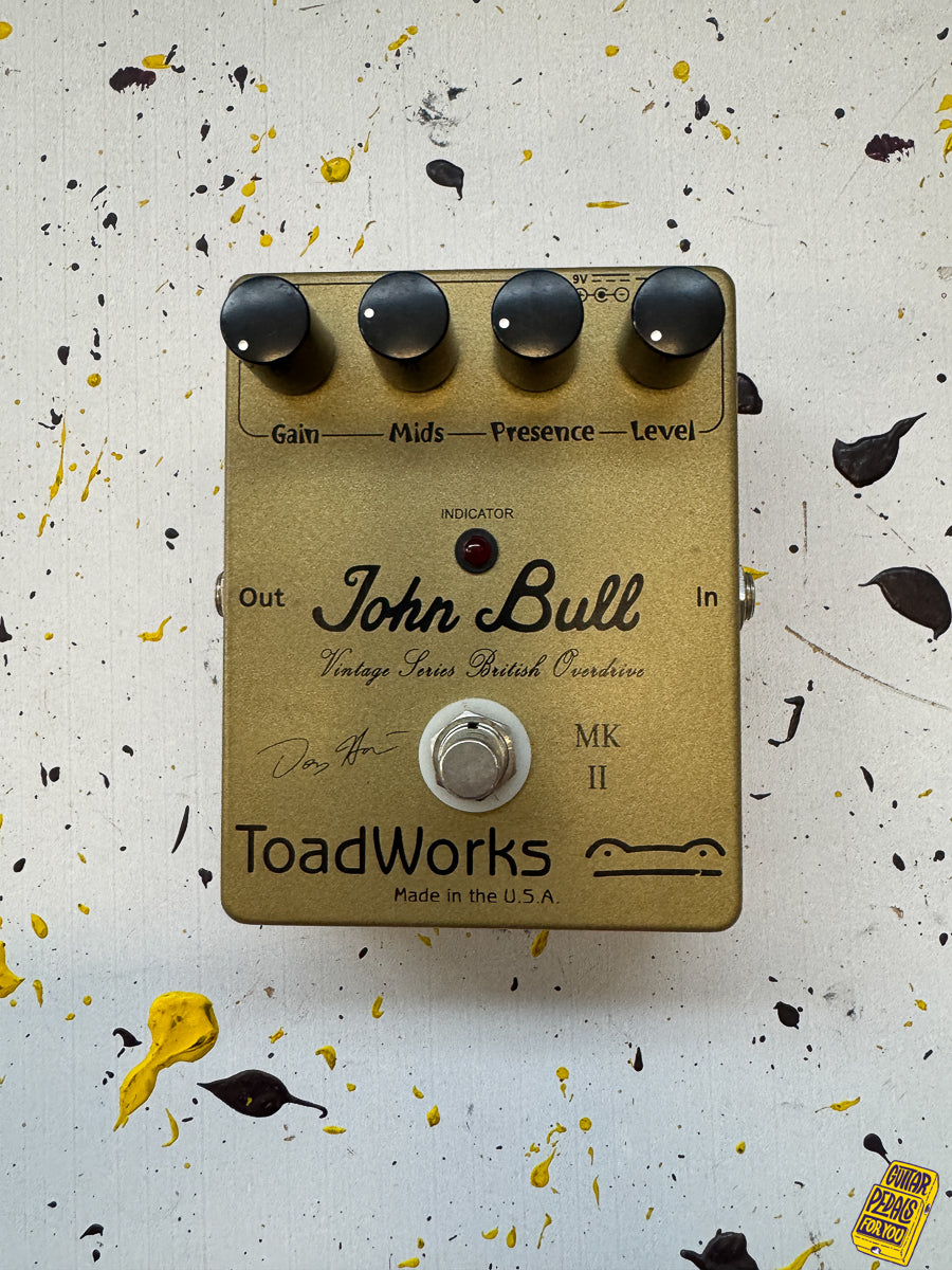 Washington-based ToadWorks USA was founded by Ryan Dunn and Doug Harrison in 2001.The John Bull emulates classic British overdrive. The John Bull has controls for Drive, Mid, and Level. Both are activated via LED-equipped on/off stompswitch.