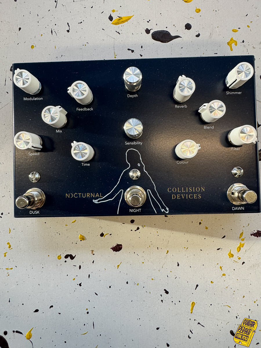 De Franse fabrikant Collision Devices heeft een zwak voor coole, maffe effectpedalen. Het Nocturnal pedaal wordt door Collision Devices Ambient Machine genoemd - en dat is precies wat het is. Met Shimmer Reverb, Modulation Delay en Dynamic Tremolo kun je ongelooflijke ambient pads en ritmische patronen maken - een klankwonderland voor elektronische en filmmuziekfreaks. De Shimmer Reverb-sectie kan voor onbepaalde tijd worden bevroren door de voetschakelaar ingedrukt te houden en vervaagt wanneer de schakelaar wordt losgelaten. Modulation Delay en Dynamic Tremolo (tremolosnelheid kan worden geregeld door velocity) kunnen nauwkeurig worden geactiveerd in de Mementary-modus met de voetschakelaar.
